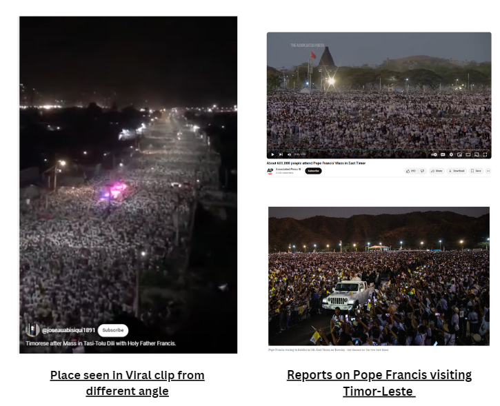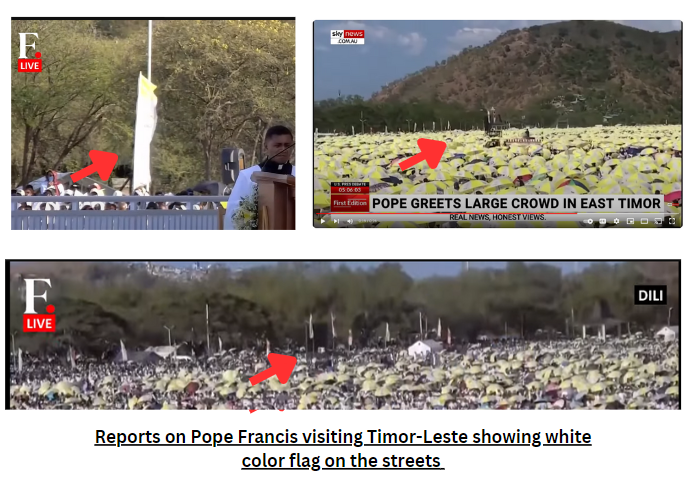 गौर करने पर हमने पाया कि वायरल क्लिप में नजर आ रहे स्थान पर सड़क के बीच में सफ़ेद रंग के झंडे लगे हैं। तिमोर-लेस्ते देश में पोप फ्रांसिस द्वारा की गई यात्रा पर फर्स्टपोस्ट और स्काई न्यूज़ द्वारा प्रकाशित रिपोर्ट्स में भी पॉप फ्रांसिस को देखने आये जनसैलाब के बीच इसी प्रकार के झंडे नजर आ रहे हैं।