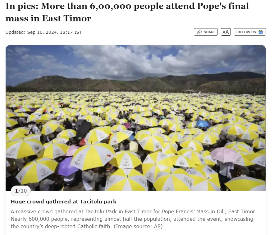 स्वतंत्र देश बनने के बाद यह पहली बार था जब किसी पोप ने पूर्वी तिमोर का दौरा किया था। 10 सितंबर 2024 को टाइम्स ऑफ़ इंडिया द्वारा प्रकाशित रिपोर्ट में बताया गया है कि अपनी 9-11 सितंबर की इस यात्रा के दौरान पूर्वी तिमोर के दिली में पोप फ्रांसिस के साथ प्रार्थना करने के लिए भारी भीड़ जमा हुई। बतौर रिपोर्ट, पूर्वी तिमोर में आयोजित इस कार्यक्रम में लगभग 600,000 लोगों ने भाग लिया।