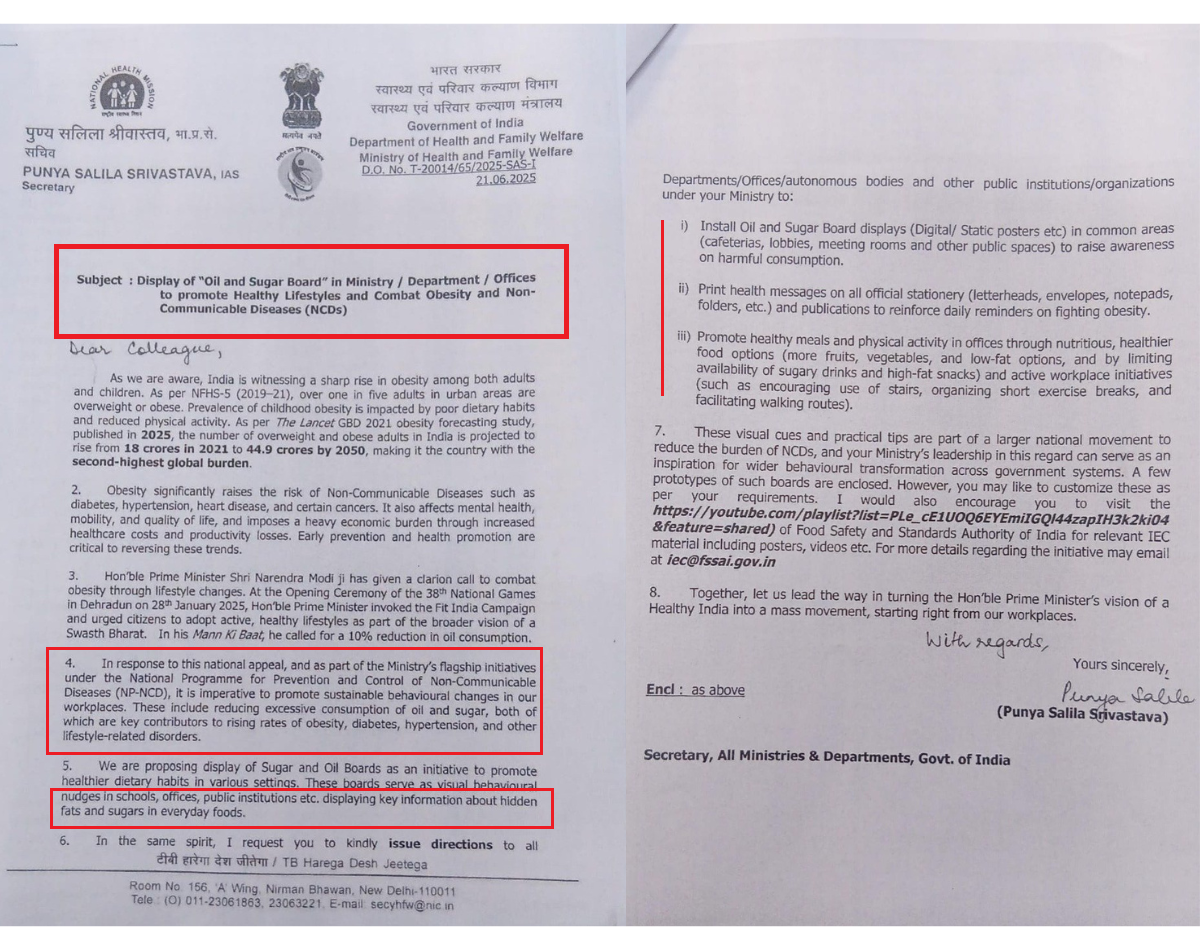 इस दावे की शुरुआत 21 जून 2025 को स्वास्थ्य मंत्रालय की ओर से जारी एक एडवाइजरी से हुई थी. इसका विषय था: “मंत्रालयों और दफ़्तरों में ‘तेल और चीनी’ से जुड़ी जानकारी वाले बोर्ड लगाने की सलाह, जिससे लोग हेल्दी लाइफस्टाइल अपनाएं और मोटापा व दूसरी बीमारियों से बचें.”