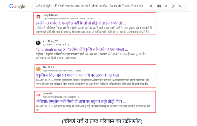 वायरल दावे की पड़ताल के लिए हमने पोस्ट में मौजूद कैप्शन से मिलते-जुलते कीवर्ड्स, “उड़ीसा में एंबुलेंस न मिलने की वजह से एक शख्स को अपनी पत्नी का शव तोड़ मरोड़ कर बोरे में भरकर ले जाना पड़ा” को इंटरनेट पर सर्च किया. इस दौरान हमें अगस्त 2016 में पंजाब केसरी और जनसत्ता द्वारा प्रकाशित रिपोर्ट्स मिलीं.