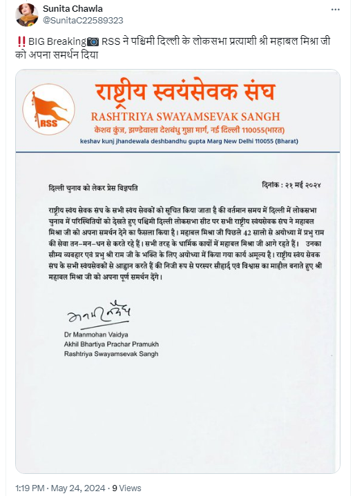 वायरल हो रहा लेटर कथित तौर पर राष्ट्रीय स्वयंसेवक संघ के अखिल भारतीय प्रचार प्रमुख मनमोहन वैद्य की तरफ से जारी किया गया है. 21 मई 2024 को कथित तौर पर जारी किए गए इस वायरल लेटर में लिखा हुआ है कि “राष्ट्रीय स्वंय सेवक संघ के सभी स्वंय सेवकों को सूचित किया जाता है की वर्तमान समय में दिल्ली में लोकसभा चुनाव में परिस्थितियों को देखते हुए पश्चिमी दिल्ली लोकसभा सीट पर सभी राष्ट्रीय स्वंयसेवक संघ ने महाबल मिश्रा जी को अपना समर्थन देने का फैसला किया है.”