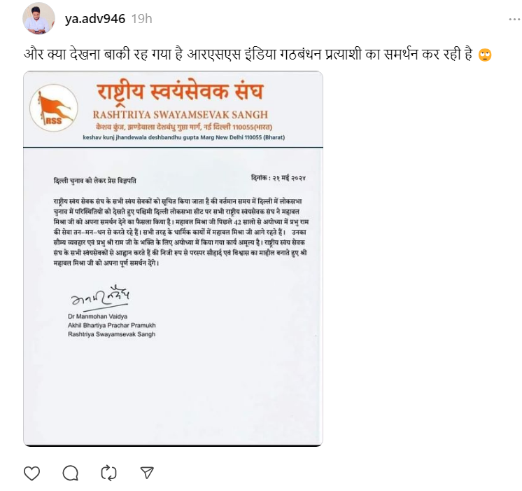 दिल्ली में इंडिया गठबंधन के उम्मीदवार महाबल मिश्रा को समर्थन देने का ऐलान करता आरएसएस का यह लेटर फर्जी है