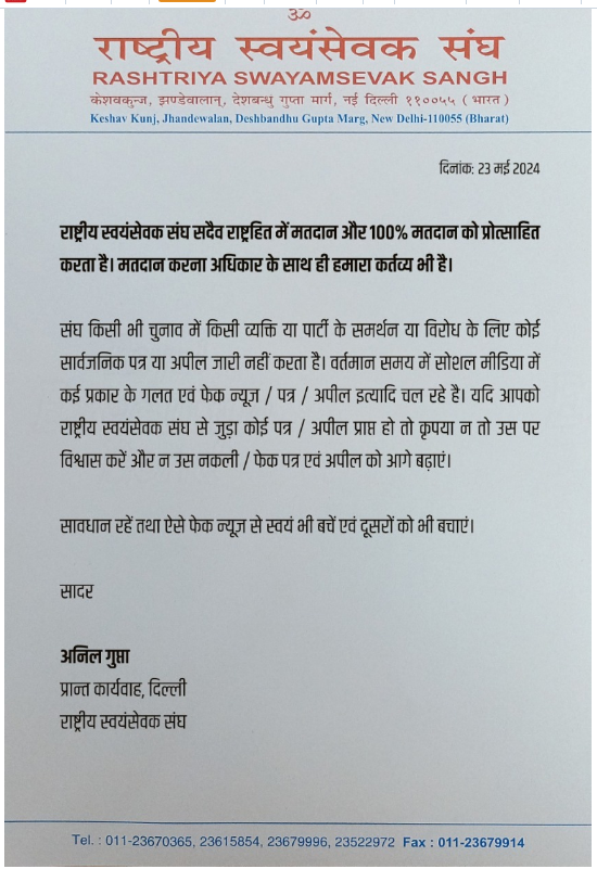 अनिल गुप्ता की तरफ से जारी किए गए लेटर में लिखा था कि “राष्ट्रीय स्वयंसेवक संघ सदैव राष्ट्रहित में मतदान और 100% मतदान को प्रोत्साहित करता है. मतदान करना अधिकार के साथ ही हमारा कर्तव्य भी है. संघ किसी भी चुनाव में किसी व्यक्ति या पार्टी के समर्थन या विरोध के लिए कोई सार्वजनिक पत्र या अपील जारी नहीं करता है. वर्तमान समय में सोशल मीडिया पर कई प्रकार के फेक न्यूज/ पत्र/ अपील इत्यादि चल रहे हैं. यदि आपको राष्ट्रीय स्वयंसेवक संघ से जुड़ा कोई पत्र/ अपील प्राप्त हो, तो कृपया न तो उसपर विश्वास करें और न उस नकली/फेक पत्र एवं अपील को आगे बढ़ाएं. सावधान रहें तथा ऐसे फेक न्यूज से स्वयं भी बचें एवं दूसरों को भी बचाएं”.