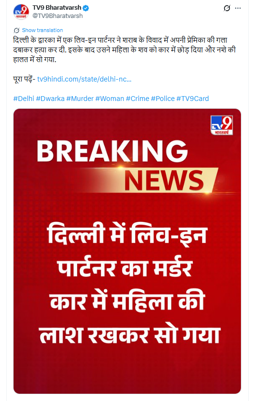 दिल्ली में हिंदू महिला की उसके मुस्लिम लिव-इन पार्टनर द्वारा हत्या किए जाने के वायरल इस दावे की पड़ताल के लिए हमने सबसे पहले टीवी9 भारत वर्ष का X अकाउंट खंगाला तो हमें 27 नवंबर 2025 को किया गया X पोस्ट मिला.