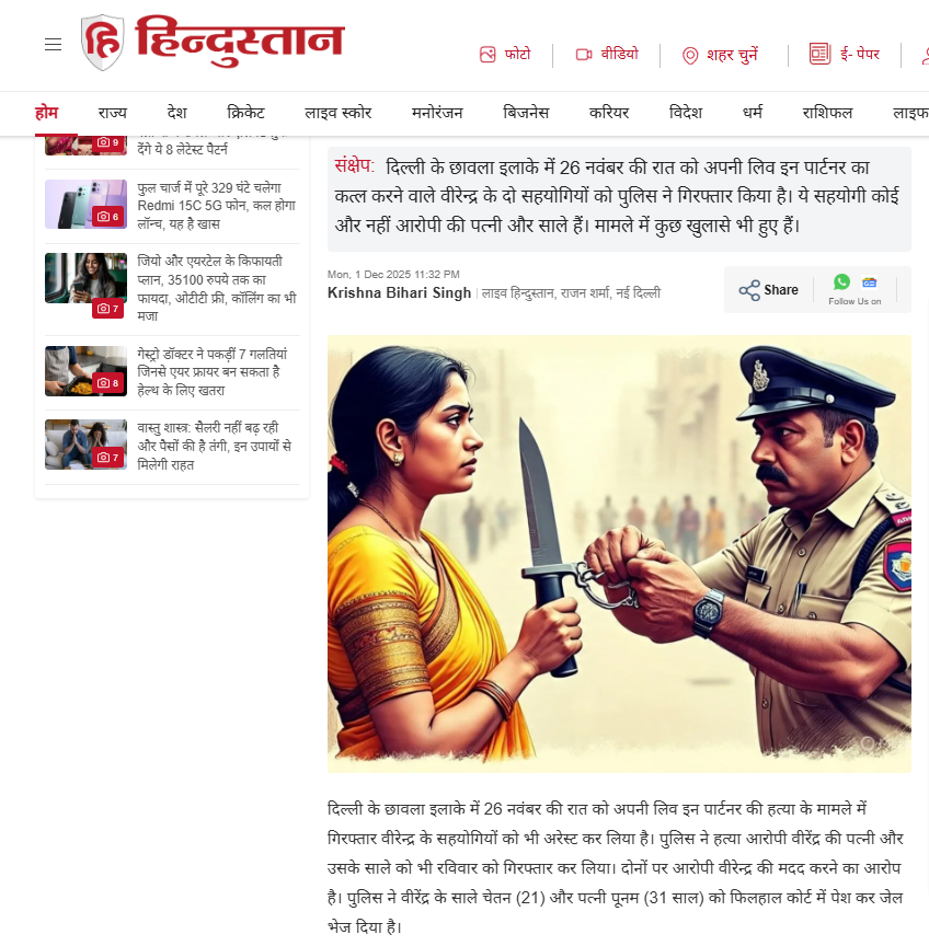 जांच में हमें इस संबंध में 1 दिसंबर 2025 को लाइव हिंदुस्तान की वेबसाइट पर प्रकाशित रिपोर्ट भी मिली. इस रिपोर्ट में बताया गया है कि दिल्ली के छावला इलाके में अपनी लिव इन पार्टनर की हत्या के मामले में पुलिस ने वीरेंद्र के सहयोगियों को भी अरेस्ट कर लिया है. पुलिस ने हत्या आरोपी वीरेंद्र की पत्नी पूनम (31 साल) और उसके साले चेतन (21) को भी रविवार को गिरफ्तार कर लिया. दोनों को कोर्ट में पेश कर जेल भेज दिया है.