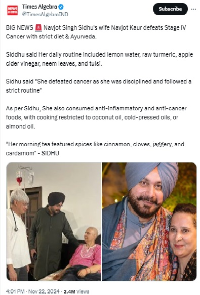 ऐसी ही एक्स पोस्ट में लिखा है, “सिद्धू ने कहा है कि उनकी दिनचर्या में नींबू पानी, कच्ची हल्दी, सेब साइडर सिरका, नीम के पत्ते और तुलसी शामिल थे। सिद्धू ने कहा ‘उन्होंने कैंसर को हराया क्योंकि वह अनुशासित थीं और सख्त दिनचर्या का पालन करती थीं।’ सिद्धू के अनुसार, उन्होंने एंटी-इंफ्लेमेटरी और कैंसर-रोधी खाद्य पदार्थों का भी सेवन किया, जिसमें खाना पकाने को नारियल तेल, कोल्ड-प्रेस्ड तेल या बादाम के तेल तक ही सीमित रखा गया। ‘उनकी सुबह की चाय में दालचीनी, लौंग, गुड़ और इलायची जैसे मसाले होते थे।”