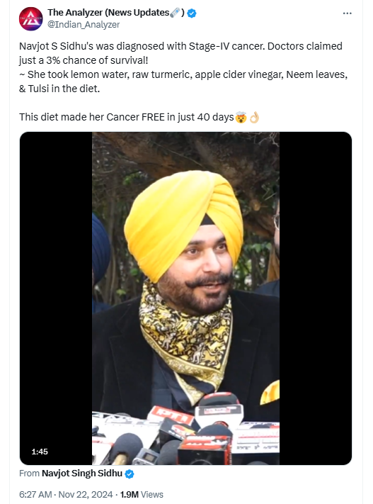 ऐसी ही एक वायरल एक्स पोस्ट में लिखा है, “इस डाइट ने उन्हें सिर्फ़ 40 दिनों में कैंसर मुक्त कर दिया।” इस पोस्ट को अब तक 1.9 मिलियन बार देखा जा चुका है। सिद्धू को आगे यह कहते हुए सुना जा सकता है कि कैसे कैंसर को जीवनशैली में सरल बदलावों से हराया जा सकता है।