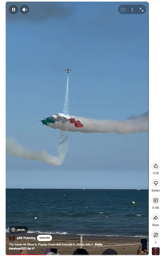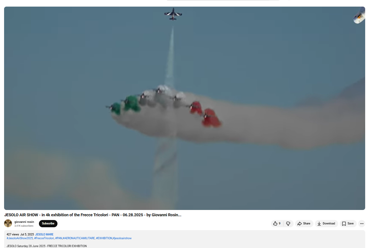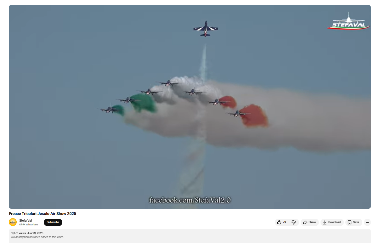 इसके अलावा हमें 5 जुलाई को एक अन्य यूट्यूब अकाउंट से अपलोड किए गए वीडियो के अंतिम हिस्से में भी उसी तरह के दृश्य देखने को मिले. इस वीडियो के साथ मौजूद डिस्क्रिप्शन में भी इसे इटली के जेसोलो में 28 जून 2025 को आयोजित हुए एयर शो का बताया गया था.