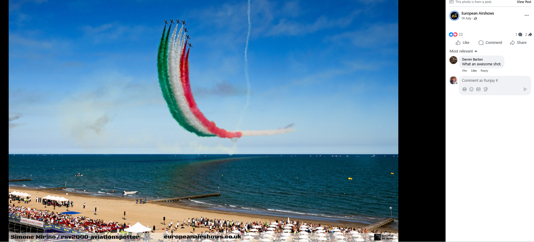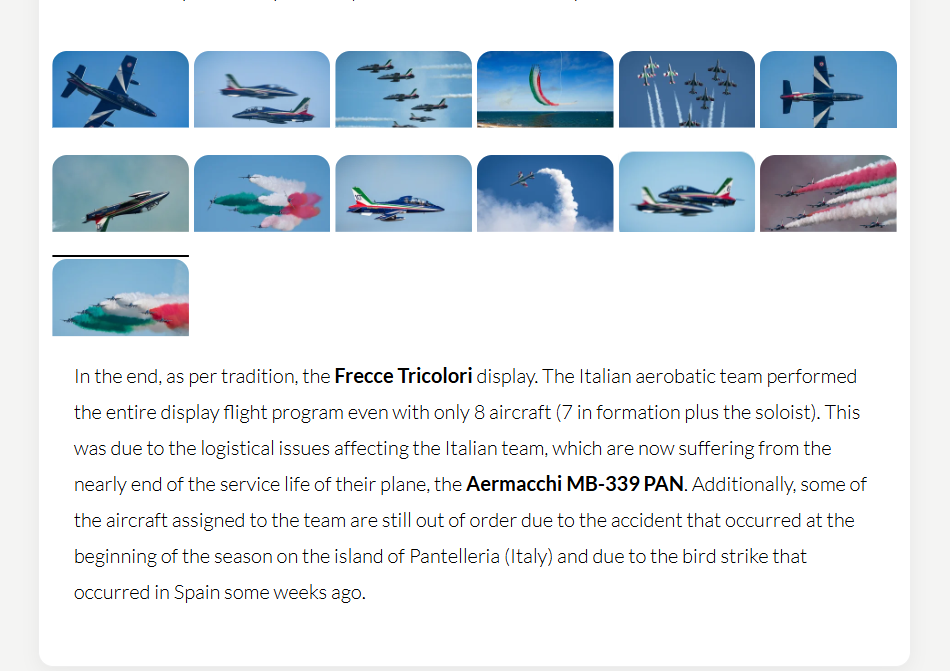 पड़ताल के दौरान हमें यूरोपियन एयर शो की वेबसाइट पर इस एयर शो को लेकर किया गया एक रिव्यू भी मिला, जिसमें बताया गया था कि 28 जून को जेसोलो एयर शो का आयोजन हुआ था और यह एयर शो जेसोलो सिटी द्वारा आयोजित किया गया था. इस एयर शो के अंत में परंपरा के अनुसार फ्रेचे ट्राईकलरी का प्रदर्शन हुआ. इटालियन एरोबेटिक टीम के 8 विमानों (7 फॉर्मेशन में और 1 सोलो पायलट वाला) ने यह प्रस्तुत किया था.