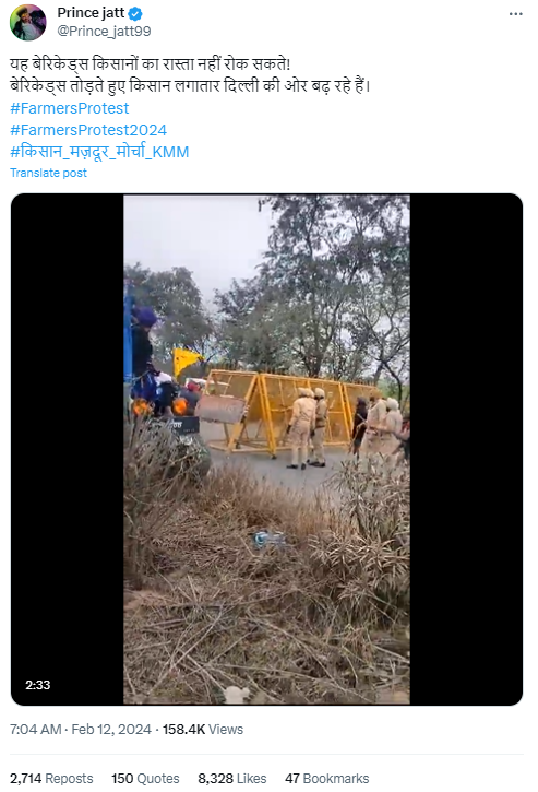 एक वेरीफाईड एक्स यूजर द्वारा शेयर किये गए इस वीडियो के साथ कैप्शन में दावा किया गया है कि बेरिकेड्स तोड़ते हुए किसान लगातार दिल्ली की ओर बढ़ रहे हैं। पोस्ट में लिखा गया है कि यह बेरिकेड्स किसानों का रास्ता नहीं रोक सकते। पोस्ट के साथ Farmers Protest, Farmers Protest 2024 और किसान मज़दूर मोर्चा जैसे हैशटैग लगाए गए हैं।