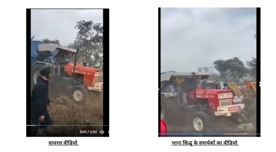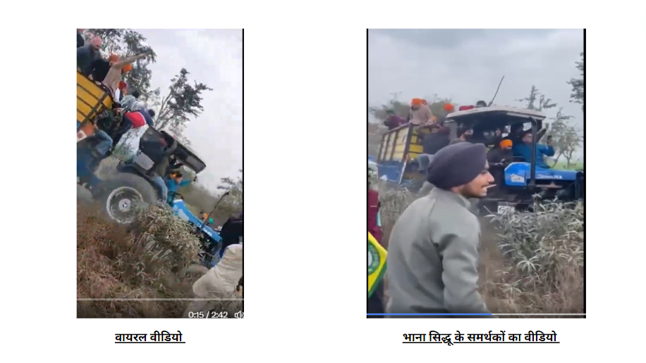प्राप्त वीडियो और वायरल वीडियो को ध्यान से देखने पर पता चलता है कि दोनों वीडियो एक ही घटनास्थल पर दो अलग-अलग एंगल से शूट किये गए हैं। मिलान करने पर ट्रैक्टर, उसपर बैठे लोग, उनकी भाव भंगिमाएं, कपड़ों के रंग सब एक जैसे नजर आते हैं। वीडियो में सुनाई दे रही आवाजें भी एक जैसी हैं।