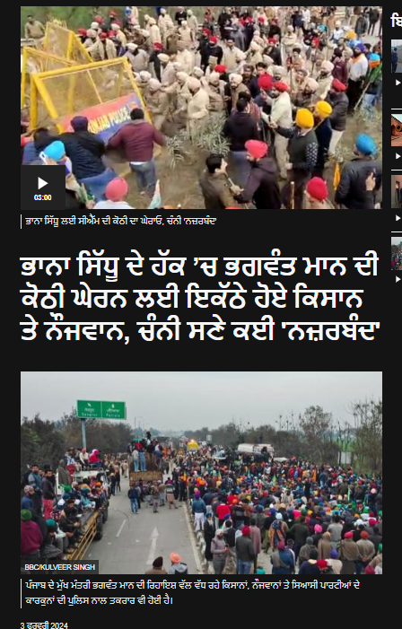 3 फरवरी को बीबीसी पंजाबी द्वारा प्रकाशित रिपोर्ट में भी इस विरोध रैली की तस्वीर देखने को मिलती हैं। इस रिपोर्ट में बताया गया है कि 3 फरवरी को भाना सिद्धू के पक्ष में किसान और युवा समर्थक भगवंत मान की कोठी घेरने के लिए इकठ्ठा हुए थे।’