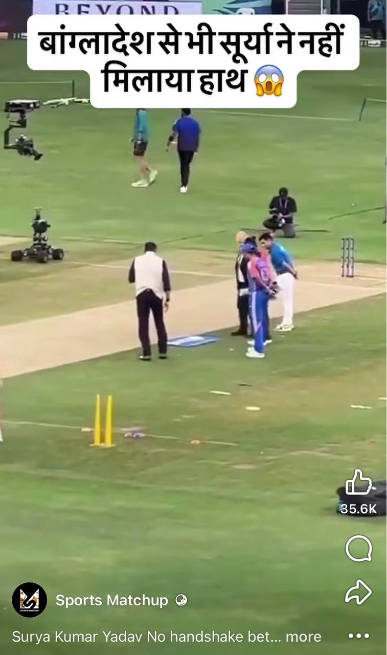 सोशल मीडिया पर एक वीडियो वायरल है, जिसमें दावा किया जा रहा है कि 24 सितंबर को भारत और बांग्लादेश के बीच दुबई में खेले गए एशिया कप सुपर फोर मैच के टॉस के दौरान दोनों टीमों के कप्तानों ने एक-दूसरे से हाथ मिलाने से इनकार कर दिया. वीडियो शेयर करते हुए कहा जा रहा है कि भारतीय टीम के कप्तान सूर्यकुमार यादव ने बांग्लादेश के कप्तान से हाथ नहीं मिलाया.
