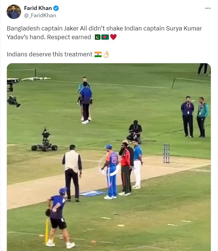 इसी वीडियो को कुछ यूज़र्स ने ठीक इसके उलट यह दावा करते हुए शेयर किया कि बांग्लादेश के कप्तान जाकिर अली ने सूर्यकुमार यादव से हाथ मिलाने से इनकार कर दिया. इन पोस्ट्स के आर्काइव यहां और यहां देखे जा सकते हैं.