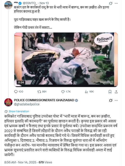 गाजियाबाद में बजरंग दल के कार्यकर्ता रामू के घर से बारूद और बम बरामद किए जाने के दावे की पड़ताल के दौरान, हमें वायरल एक्स पोस्ट के रिप्लाई सेक्शन में गाजियाबाद पुलिस द्वारा दिया गया जवाब मिला.