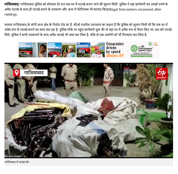 रिपोर्ट में बताया गया था कि यह मामला गाजियाबाद के लोनी थाना क्षेत्र के निठोरा रोड का है. सीओ रजनीश उपाध्याय के अनुसार, पुलिस को सूचना मिली थी कि एक घर में अवैध रूप से पटाखे बन रहे हैं, जिसके बाद पुलिस ने मौके पर पहुंचकर छापेमारी की और अवैध रूप से तैयार किए गए अधबने पटाखे बरामद किए. इस दौरान पुलिस ने सभी उपकरणों के साथ अवैध पटाखे भी जब्त कर लिए थे और एक आरोपी को भी गिरफ्तार किया था.