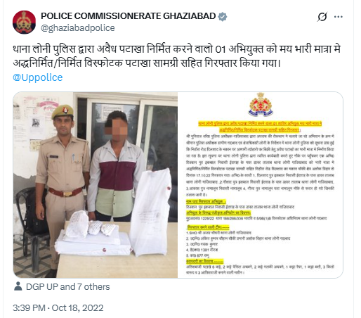 इसी दौरान हमें गाजियाबाद पुलिस की तरफ से 18 अक्टूबर 2022 को किया गया X पोस्ट भी मिला. रिपोर्ट में मौजूद प्रेस रिलीज में भी बताया गया था कि ‘लोनी पुलिस को सूचना प्राप्त हुई थी कि निठोरा रोड दिलशाद के मकान में अवैध पटाखों का निर्माण किया जा रहा है. जिसके बाद थाना लोनी पुलिस ने कार्रवाई करते हुए हुए एक अभियुक्त रिजवान पुत्र इकबाल निवासी लोनी गाजियाबाद को भारी मात्रा मे अद्धनिर्मित और निर्मित विस्फोटक पटाखा सामग्री सहित 17 अक्टूबर 2022 को गिरफ्तार किया था. इसके अलावा उसके कुछ साथी दिलशाद, नौशाद, आकाश और गौरव फरार हो गए थे, जिनकी तलाश की जा रही है.’