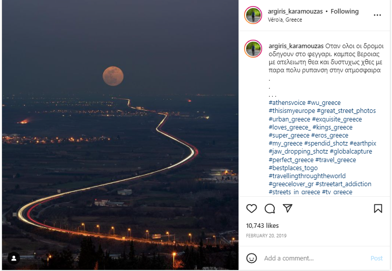 सोशल मीडिया पर वायरल जगमगाती सड़क की तस्वीर का सच पता लगाने के लिए हमने इसे गूगल पर रिवर्स सर्च किया. इस दौरान हमें एक इंस्टाग्राम पोस्ट मिला, जिसमें बताया गया था कि इस तस्वीर को Argiris Karamouzas नाम के एक फोटोग्राफर ने खींचा है. इस पोस्ट की मदद से हम Argiris Karamouzas के इंस्टाग्राम प्रोफाइल पर पहुंचे. उन्होंने खुद भी इस फोटो को फरवरी 2019 में शेयर किया था और ग्रीक भाषा में लिखा था कि यह तस्वीर ग्रीस के वेरिया शहर की है.