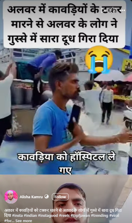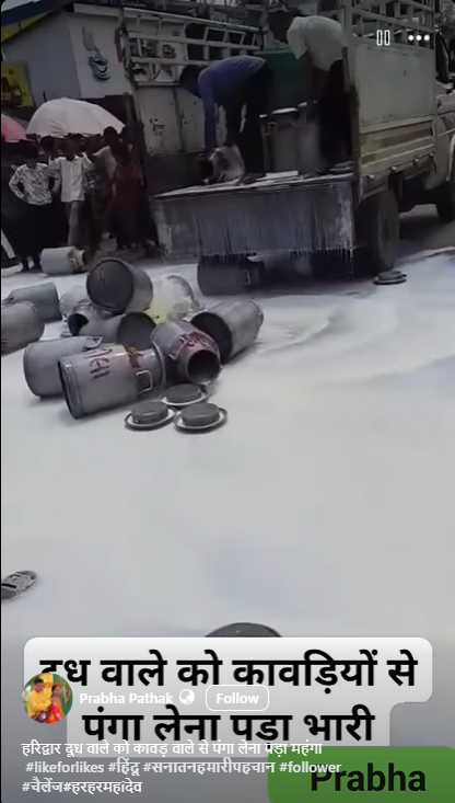 सोशल मीडिया पर कुछ लोगों द्वारा दूध के कंटेनरों को सड़क पर पानी की तरह बहाए जाने का वीडियो तेजी से शेयर किया जा रहा है। दावा किया गया है कि दूध वाले को कांवड़ियों से पंगा लेना पड़ा,भारी, कांवड़ियों ने गुस्से में आकर दूध वाले की गाड़ी का सारा दूध सड़क पर गिरा दिया। इस वीडियो में कुछ लोग एक कार को पीछे जाने के लिए भी इशारा कर रहे हैं। वीडियो को सोशल मीडिया पर हरिद्वार और राजस्थान के अलवर का बताया जा रहा है। पोस्ट का आर्काइव यहां देखा जा सकता है। ऐसे अन्य दावों को यहां और यहां देखा जा सकता है।
