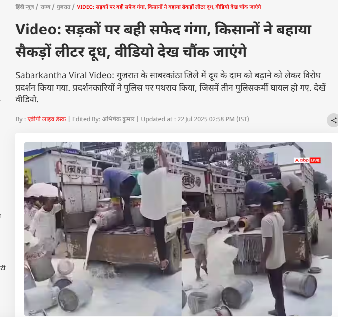 ‘दूध वाले को कांवड़ियों से पंगा लेना पड़ा भारी’, दावे के साथ शेयर किए जा रहे इस वीडियो की पड़ताल के लिए हमने वीडियो के कीफ्रेम्स को रिवर्स सर्च किया। इस दौरान हमें अहमदाबाद मिरर की वेबसाइट पर 17 जुलाई को प्रकाशित एक खबर मिली। इस रिपोर्ट में वायरल वीडियो के दृश्य मौजूद हैं। रिपोर्ट में बताया गया है कि पशुपालकों ने दूध की खरीद कीमतों को बढ़ाने की मांग को लेकर साबरकांठा और अरावली जिलों में प्रदर्शन किया।