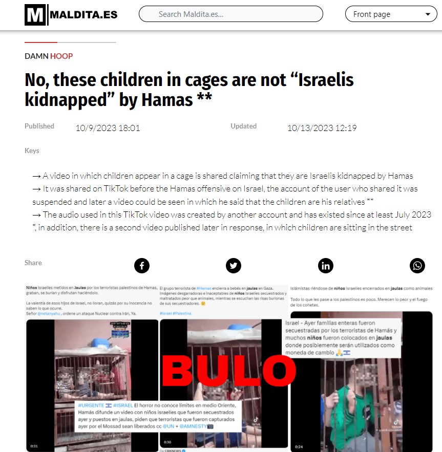 चूंकि, इसराइल-फिलीस्तीन संघर्ष की शुरुआत ही 7 अक्टूबर से हुई है. इसलिए मामला संदिग्ध लगने पर हमने अपनी जांच को आगे बढ़ाया. हमें इस दौरान स्पैनिश फैक्ट चेकिंग आउटलेट Maldita.es की वेबसाइट पर 9 अक्टूबर 2023 को प्रकाशित रिपोर्ट मिली.