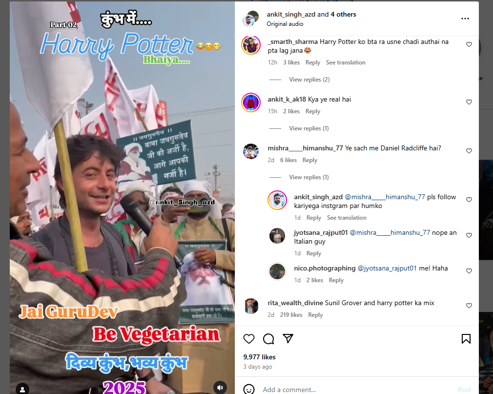 इस इंस्टाग्राम अकाउंट पर यह वीडियो पहली बार 19 जनवरी 2025 को अपलोड किया गया था. हालांकि, बाद में इस वीडियो में मौजूद कैप्शन को 25 जनवरी 2025 को अपडेट किया गया और बताया गया कि वीडियो में हैरी पॉटर दिखने वाला शख्स असल में निकोलो ब्रुगनारा हैं. इस दौरान निकोलो का इंस्टाग्राम हैंडल भी शेयर किया था.