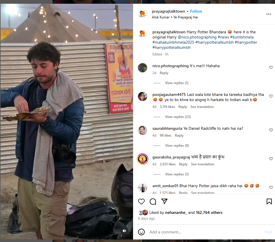 वायरल वीडियो में एक शख्स जो काफी हद तक डेनियल रेडक्लिफ की तरह दिख रहा है, वह महाकुंभ में भंडारा खाता हुआ दिखाई दे रहा है. इस दौरान एक माइक उसकी तरफ बढ़ती है और वह माइक पर कुछ जवाब देता है. हालांकि, वीडियो के बैकग्राउंड में ऑडियो ट्रैक मौजूद होने के कारण व्यक्ति की आवाज स्पष्ट नहीं होती।