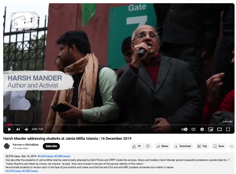 करीब 8 मिनट के इस वीडियो में हर्ष मंदर प्रदर्शनकारियों से संविधान और भाईचारा बचाने के लिए लड़ने को कहते हुए सुनाई दे रहे हैं. करीब 3 मिनट 15 सेकेंड से वह यह कहते हुए सुनाई दे रहे हैं कि “हम ये कहते हैं कि ये एक ही देश है हिन्दुस्तान और इस देश से, इस देश पर, इस देश के मुसलमान, हिंदू, सिख, ईसाई, बौद्ध, नास्तिक, आदिवासी, दलित, गरीब अमीर, महिला-पुरुष सबको हर तरह से बराबर का हक है और कोई किसी को जो आपसे यह सवाल पूछता है और आपके हक वापस लेने का दावा करता है. उनका विरोध ये पूरे देश में एक सैलाब शुरू हुआ है और ये अपने देश के संविधान और अपने संविधान की आत्मा, जो मोहब्बत है. जो बंधुता है उसको बचाने के लिए है. उसको बचाने के लिए हम लोग सब सड़क पर निकले हैं और निकले रहेंगे”.