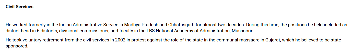 जांच में हमने यह भी पाया कि हर्ष मंदर के गुजरात कैडर के पूर्व आईएएस होने वाला दावा भी फर्जी है. हर्ष मंदर की वेबसाइट और न्यूज रिपोर्ट के अनुसार, वे भारतीय प्रशासनिक सेवा (IAS) के 1980 बैच के अधिकारी थे और उन्हें मध्य प्रदेश कैडर आवंटित किया गया था और उन्होंने छत्तीसगढ़ में भी अपनी सेवाएं दी थी. लेकिन 2002 गुजरात दंगों के बाद उन्होंने आईएएस से इस्तीफा दे दिया था.
