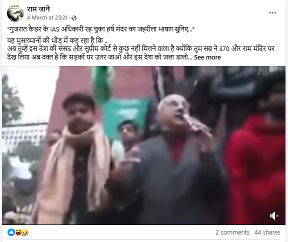 सोशल मीडिया पर पूर्व नौकरशाह और सामाजिक कार्यकर्ता हर्ष मंदर के एक वीडियो को शेयर कर दावा किया जा रहा है कि उन्होंने जहरीला भाषण दिया और मुसलमानों को सड़क पर उतरकर देश जलाने के लिए उकसाया.