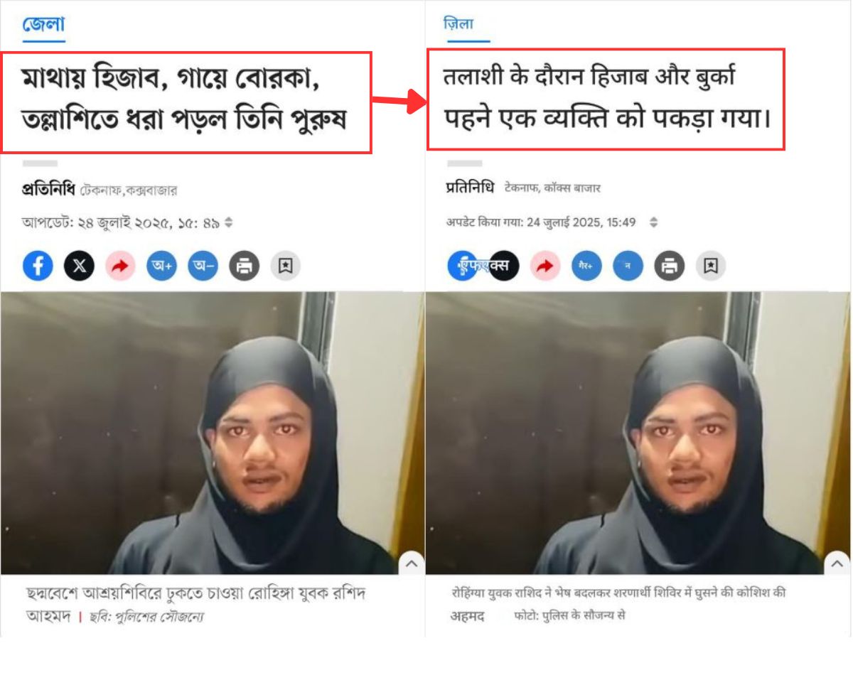 बांग्लादेशी मीडिया आउटलेट प्रोथोमालो की 24 जुलाई की रिपोर्ट में बताया गया है कि वीडियो में बुर्क़ा पहने दिख रहे व्यक्ति की पहचान 27 वर्षीय राशिद अहमद के रूप में हुई है, जिसे कॉक्स बाज़ार के टेकनाफ़ इलाके में शालबागान चेकपोस्ट के पास पुलिस ने हिरासत में लिया था. राशिद, रोहिंग्या कैंप नंबर 26 के निवासी फ़रीद अहमद का बेटा है.