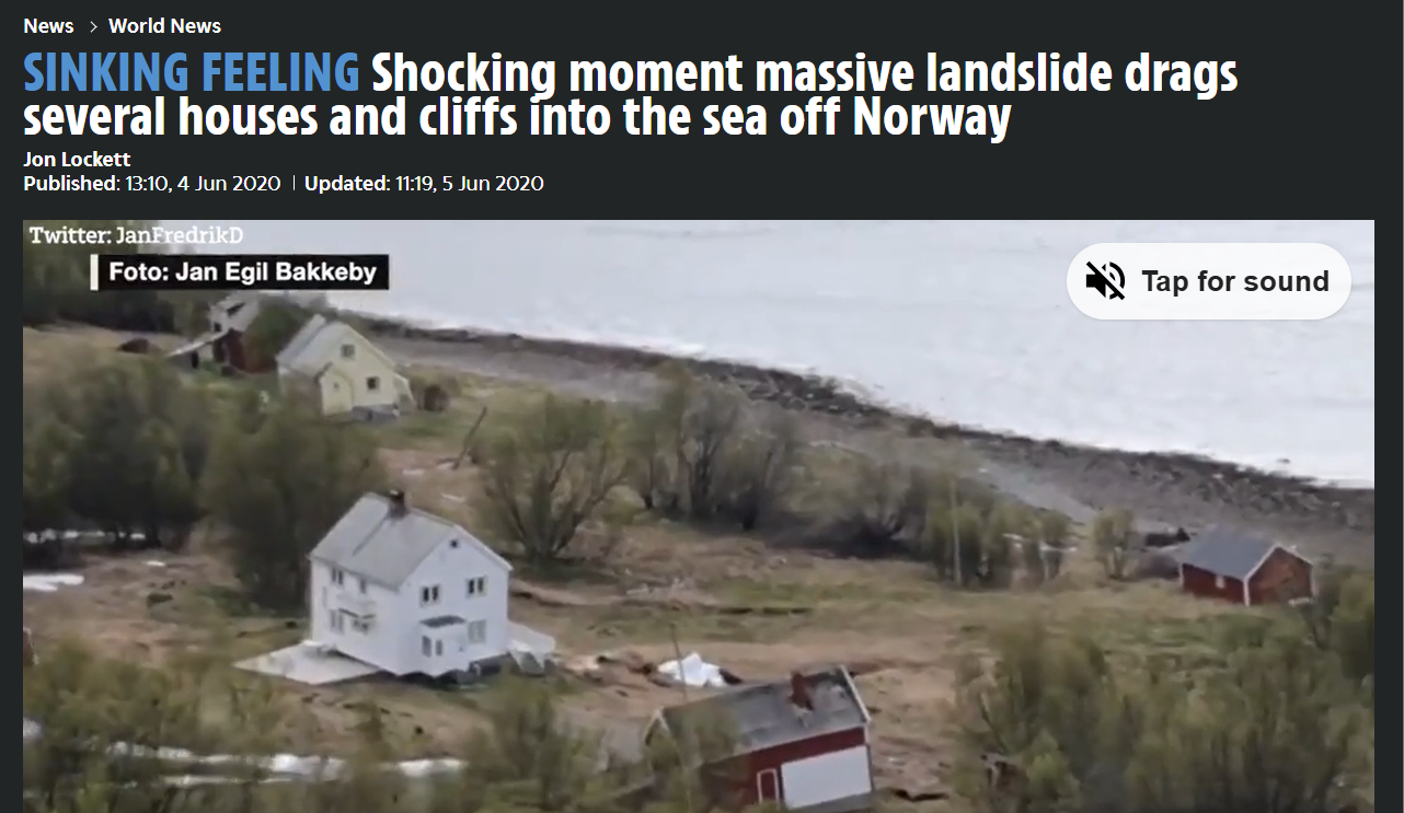पानी में बहते घरों के इस वीडियो की पड़ताल के दौरान हमें The Telegraph के यूट्यूब चैनल पर भी 5 जून 2020 को अपलोड किया गया यह वीडियो मिला। वीडियो के डिस्क्रिप्शन में इसे नार्वे के अल्टा का बताया गया है, जहां भयंकर लैंडस्लाइड के चलते 8 घर समुद्र में बह गए थे। यहां बताया गया है कि इस वीडियो को अल्टा के एक स्थानीय निवासी जान एगिल बक्केडाल ने शूट किया था।