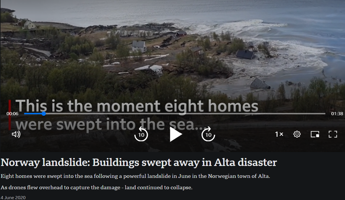 जम्मू में हुए भूस्खलन का बताकर शेयर किए वीडियो की पड़ताल के दौरान हमें बीबीसी की वेबसाइट पर भी 4 जून 2020 को प्रकाशित खबर में यह वीडियो मिला। रिपोर्ट में बताया गया है कि पानी में बहते घरों का यह वीडियो नार्वे के अल्टा का है, जहां शक्तिशाली लैंडस्लाइड के चलते 8 घर समुद्र में बह गए थे।