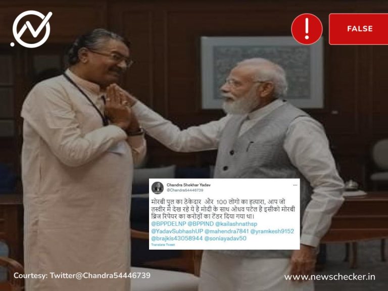 सोशल मीडिया पर पीएम मोदी के साथ खड़े एक व्यक्ति की तस्वीर के साथ दावा किया जाने लगा कि यह वही व्यक्ति है, जिसे राज्य सरकार ने मोरबी का पुल बनाने का ठेका दिया था। हमारी पड़ताल में यह दावा फर्जी साबित हुआ। फैक्ट चेक यहां पढ़ा जा सकता है।
