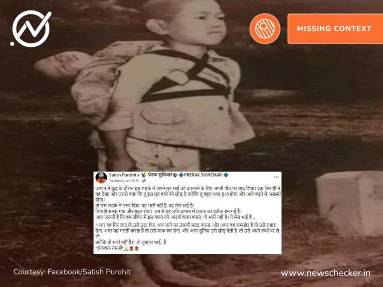 सोशल मीडिया पर एक लड़के की पीट पर बंधे एक नन्हे बच्चे की तस्वीर वायरल हो गई। दावा किया जाने लगा कि यह तस्वीर जापान की है, जब विश्वयुद्ध के दौरान अपने छोटे भाई की मौत पर इस लड़के ने वहां खड़े एक अमेरिकी सैनिक से मार्मिक बातचीत की थी। हमारी पड़ताल में यह दावा भ्रामक साबित हुआ। पूरा फैक्ट चेक यहां पढ़ा जा सकता है।