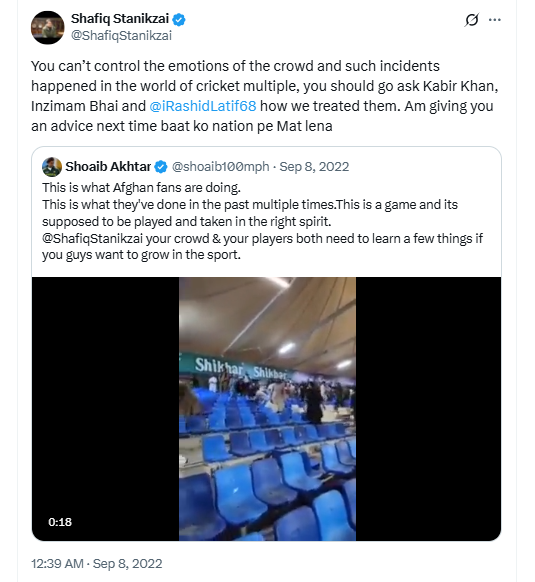 पोस्ट के जवाब में शफीक ने भी लिखा था कि ‘आप भीड़ की भावनाओं को नियंत्रित नहीं कर सकते और ऐसे घटनाक्रम क्रिकेट की दुनिया में कई बार हो चुके हैं. आपको जाकर कबीर खान, इंज़माम भाई और राशिद लतीफ़ से पूछना चाहिए कि हमने उनके साथ कैसा व्यवहार किया था. मैं आपको एक सलाह दे रहा हूं, अगली बार बात को अपने देश पर मत लेना”.