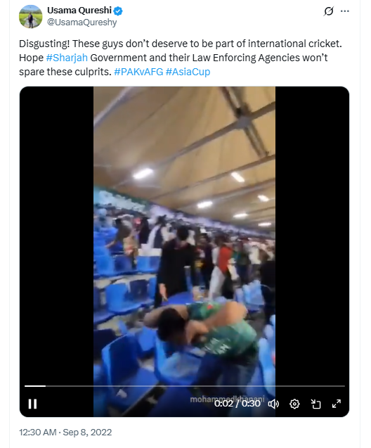 भारत से मैच हारने के बाद पाकिस्तानियों द्वारा दुबई स्टेडियम में तोड़फोड़ किए जाने के दावे से वायरल इस वीडियो की पड़ताल में हमें कीफ्रेम की मदद से रिवर्स सर्च करने पर एक पाकिस्तानी X अकाउंट से 8 सितंबर 2022 को पोस्ट किया गया यह वीडियो मिला. पोस्ट के कैप्शन में इस वीडियो को एशिया कप 2022 में पाकिस्तान और अफगानिस्तान के बीच खेले गए मैच के दौरान का बताया गया है.