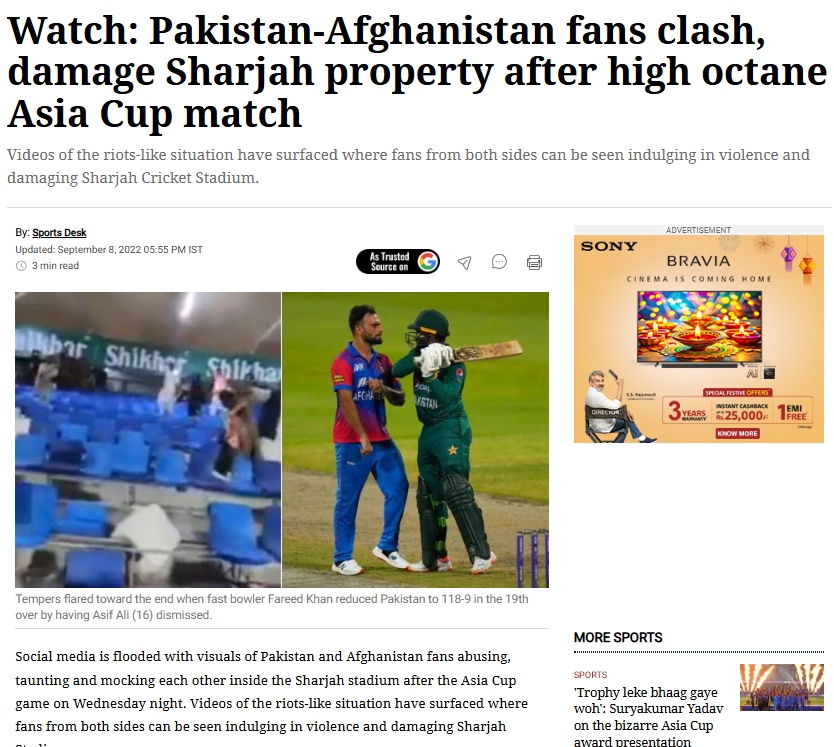रिपोर्ट में बताया गया था कि शारजाह में 7 सितंबर 2022 को मैच खेला गया था. मैच के अंत में माहौल उस समय गर्म हो गया जब अफगानिस्तानी बॉलर फरीद खान ने पाकिस्तान के आसिफ अली को आउट कर दिया. इसके बाद दोनों खिलाड़ियों के बीच तीखी नोकझोंक हुई, आसिफ ने अपना बल्ला फरीद के चेहरे के पास उठा दिया और दोनों ने एक-दूसरे को धक्का दिया, जिसके बाद अफगानिस्तान के खिलाड़ी बीच-बचाव के लिए दौड़े. इसके बाद ही दोनों देशों के प्रशंसकों के बीच भी स्टेडियम में काफी झड़पें हुई थीं.