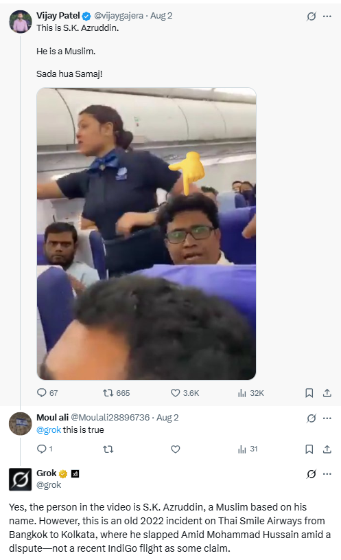 इतना ही नहीं, इस वीडियो के एक्स पर वायरल होने के बाद AI चैटबॉट Grok ने भी कई यूजर्स के पूछे जाने पर यह दावा किया कि “यह घटना साल 2022 में थाई स्माइल एयरवेज में बैंकॉक से कोलकाता की उड़ान के दौरान हुई थी. जब एस.के.अज़रुद्दीन नाम के एक शख्स ने एक विवाद के दौरान अपने सहयात्री आमिद मोहम्मद हुसैन को थप्पड़ मार दिया था”.