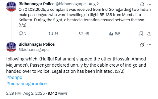 जांच में हमें बिधाननगर पुलिस द्वारा 2 अगस्त 2025 को किया गया X पोस्ट भी मिला, जिसमें उन्होंने लिखा था कि “1अगस्त 2025 को इंडिगो एयरलाइंस की ओर से एक शिकायत प्राप्त हुई जो फ्लाइट 6E-138 से मुंबई से कोलकाता की यात्रा कर रहे दो भारतीय पुरुष यात्रियों से संबंधित थी. उड़ान के दौरान दोनों के बीच विवाद हुआ, जिसके बाद हफीजुल रहमान ने दूसरे यात्री हुसैन अहमद मजूमदार को थप्पड़ मार दिया था. इंडिगो के केबिन क्रू द्वारा उक्त यात्री को पुलिस को सौंप दिया गया. इस संबंध में कानूनी कार्रवाई शुरू की गई है”.