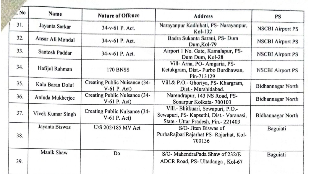 पड़ताल के दौरान हमें बिधाननगर पुलिस द्वारा 1 अगस्त को अलग-अलग मामलों में हिरासत में लिए गए लोगों की लिस्ट भी मिली. जिसमें एयरपोर्ट पुलिस स्टेशन द्वारा भारतीय नागरिक सुरक्षा संहिता की धारा 170 के तहत गिरफ्तार किए गए हफीजुल रहमान का नाम भी शामिल था.