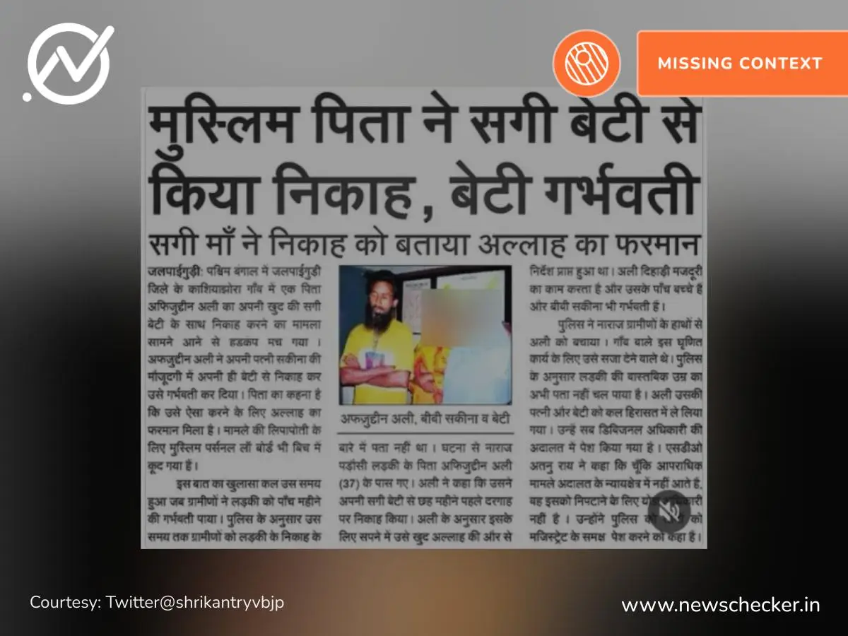 सोशल मीडिया पर एक चौंकाने वाली खबर का स्क्रीनशॉट काफी वायरल हो रहा है. वायरल खबर में बताया गया है कि पश्चिम बंगाल के जलपाईगुड़ी में एक मुस्लिम पिता ने अपनी सगी बेटी से निकाह कर उसे गर्भवती कर दिया. खबर में एक फोटो मौजूद है, जिसमें एक व्यक्ति दो महिलाओं के साथ खड़ा देखा जा सकता है.