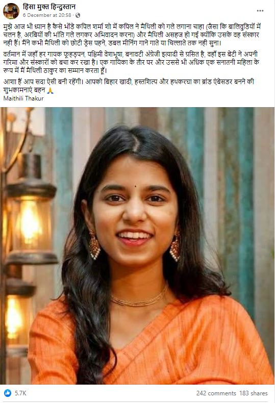 सोशल मीडिया पर एक पोस्ट शेयर कर दावा किया जा रहा है कि प्रसिद्ध लोकगायिका मैथिली ठाकुर को कॉमेडियन कपिश शर्मा ने अपने शो में गले लगाने की कोशिश की, जिससे वह असहज हो गईं।