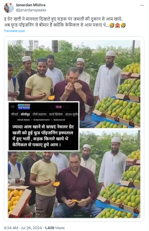 Fact Check: मुस्लिम दुकानदार के ठेले से आम खाने पर ‘द ग्रेट खली’ को फूड पॉइजनिंग होने का दावा फर्जी है