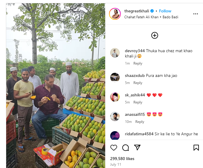 पोस्ट में नजर आ रही खली की तस्वीर वाले वीडियो के साथ कुछ समय पहले दावा किया गया था कि ‘द ग्रेट खली’ ने मुस्लिम विक्रेता की दुकान से आम खाकर कांवड़ यात्रा पर यूपी सरकार द्वारा नेम प्लेट लगाने को लेकर दिए गए आदेश का विरोध किया है। जांच में हमने पाया था कि खली ने मुस्लिम विक्रेता की दुकान से आम खाने का वीडियो 11 जुलाई को पोस्ट किया था, जबकि नेम प्लेट विवाद 17 जुलाई के बाद शुरू हुआ था। फैक्ट चेक यहाँ पढ़ें।