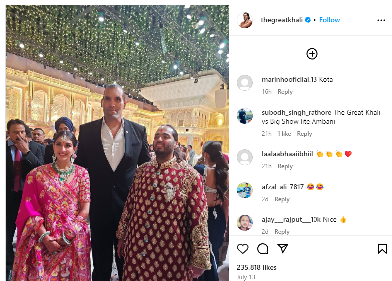 इसके बाद खली मुंबई में अनंत अंबानी की शादी समारोह में भी नजर आये थे। जिसकी विभिन्न वीडियो उन्होंने 13 जुलाई को अपने सोशल मीडिया अकाउंट से शेयर की हैं।