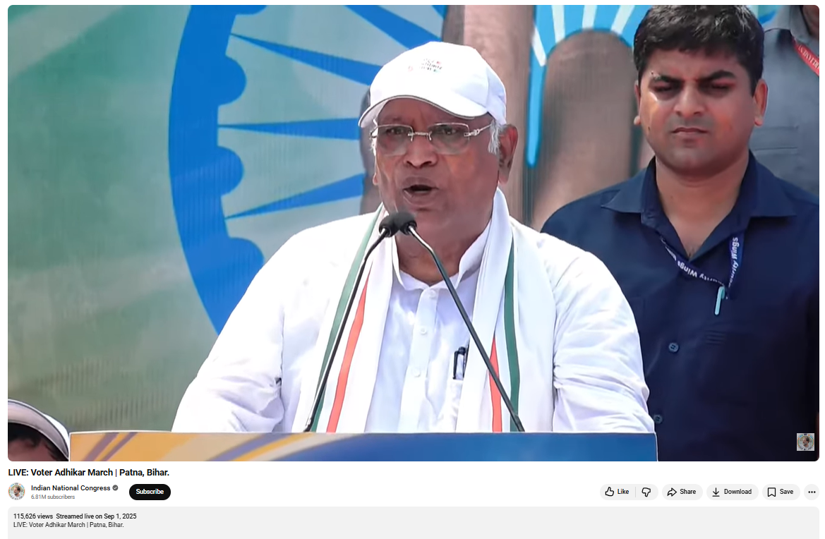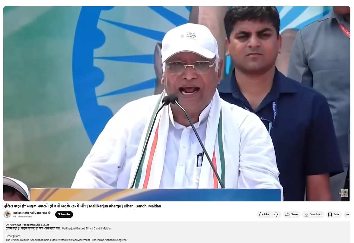 राहुल गांधी और तेजस्वी यादव पर मल्लिकार्जुन खड़गे द्वारा निशाना साधे जाने के दावे से वायरल वीडियो की पड़ताल के दौरान कीफ्रेम की मदद से रिवर्स इमेज सर्च करने पर कांग्रेस पार्टी के यूट्यूब अकाउंट से 1 सितंबर 2025 को लाइव किया गया वीडियो मिला.