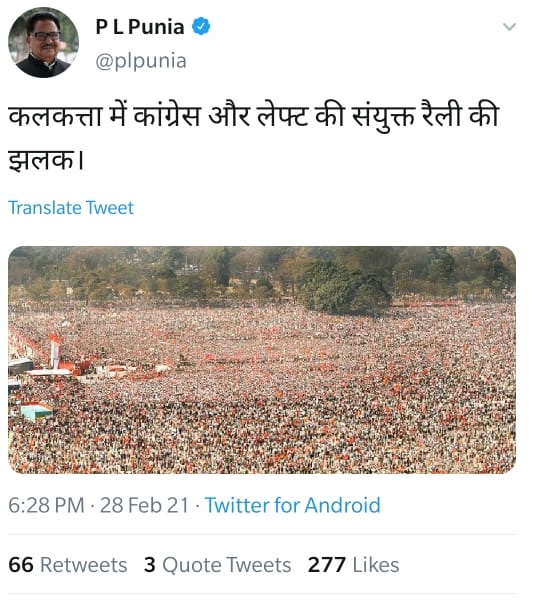 कांग्रेस और इंडियन सेकुलर फ्रंट ने अपने कई ट्विटर अकाउंट से इस तस्वीर को शेयर किया। कांग्रेस नेता P.L. Punia और इंडियन सेकुलर फ्रंट के नेता MD salim ने भी इस तस्वीर को कोलकाता ब्रिगेड परेड ग्राउंड रैली का बताते हुए शेयर किया। हालांकि दोनों ने ही इस तस्वीर को बाद में डिलीट भी कर दिया।