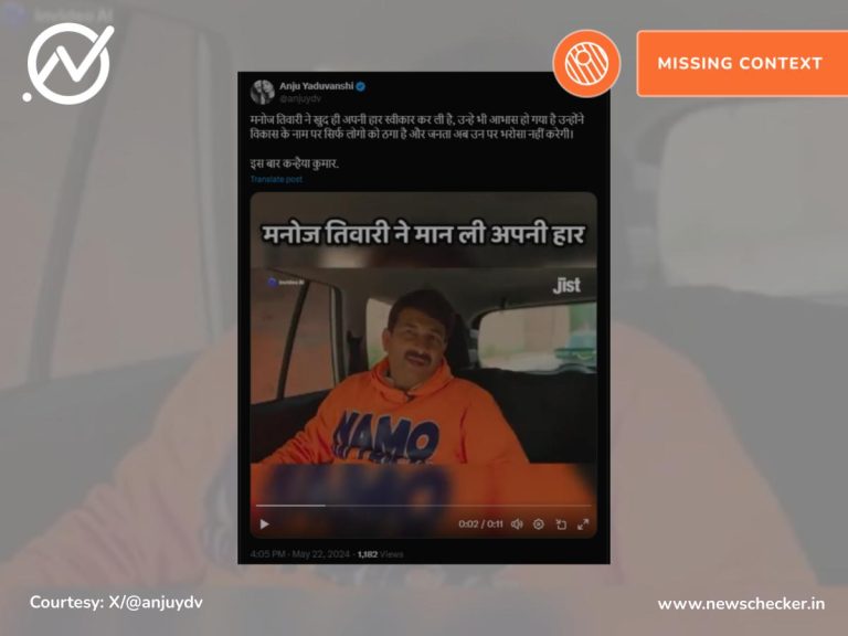 सोशल मीडिया यूजर्स ने एक वीडियो शेयर कर दावा किया कि मनोज तिवारी ने लोकसभा चुनाव में नतीजे आने से पहले ही अपनी हार मान ली है। हमारी जांच में ये दावा फर्जी साबित हुआ। फैक्ट चेक यहां पढ़ें।