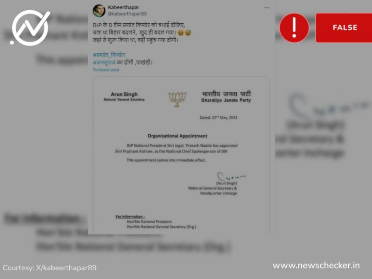 सोशल मीडिया पर एक चिट्ठी के जरिए दावा किया गया कि भाजपा ने प्रशांत किशोर को प्रवक्ता नियुक्त किया है। हमारी पड़ताल में ये दावा फर्जी निकला। फैक्ट चेक यहां पढ़ें।